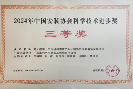 近日,中國安裝協(xié)會科技成果總結交流會圓滿落幕,會上公布2025年度科學技術進步獎評審結果,裝備公司陽江公司憑借《超大型海上風電機組塔筒產(chǎn)業(yè)化制造及成套海運關鍵技術》,一舉拿下2024年中國安裝協(xié)會科學技術進步獎三等獎,在安裝行業(yè)科技創(chuàng)新領域留下濃墨重彩的一筆。 中國安裝協(xié)會科學技術進步獎,是安裝行業(yè)技術領域的“金字招牌”,代表著行業(yè)技術創(chuàng)新的最高水平。此獎項著重獎勵在機電安裝施工中,能帶來顯著經(jīng)濟效益與社會效益的技術突破,是推動行業(yè)技術迭代升級、實現(xiàn)高質(zhì)量發(fā)展的強勁引擎。 陽江公司此次獲獎的技術,精準直擊海上風電塔筒制造與運輸?shù)膬纱箨P鍵難題。在塔筒制造環(huán)節(jié),陽江公司科研團隊自主研發(fā)20余種專用工裝設備,形成多項高效制造技術。這些技術如同為塔筒生產(chǎn)安裝上了“智能加速器”,生產(chǎn)流程更流暢,效率大幅提升,產(chǎn)品質(zhì)量也更加穩(wěn)定可靠,為海上風電的大規(guī)模開發(fā)提供了堅實的裝備保障。海上環(huán)境復雜,塔筒防腐至關重要。陽江公司通過優(yōu)化熱噴鋅厚度、改進防腐結構與工藝,打造出一套完善的成套防腐技術方案。該技術為塔筒穿上了一層“防腐鎧甲”,有效抵御鹽霧侵蝕,延長塔筒使用壽命,降低后期維護成本,保障海上風電設施穩(wěn)定運行。運輸方面,陽江公司研發(fā)的海上風電塔筒遠洋雙層疊裝技術,堪稱行業(yè)創(chuàng)新典范。它突破傳統(tǒng)運輸模式限制,增加船舶單程裝載量,提升運輸效率,大幅降低運輸成本,解決了海上風電塔筒遠距離、大規(guī)模運輸?shù)碾y題。 此次獲獎,是對陽江公司科技創(chuàng)新能力的有力證明。展望未來,陽江公司將以此為契機,深化產(chǎn)學研合作,加速科技成果轉(zhuǎn)化,為海上風電產(chǎn)業(yè)技術進步和高質(zhì)量發(fā)展持續(xù)注入創(chuàng)新動力,助力“四局裝備”乘風破浪、行穩(wěn)致遠。