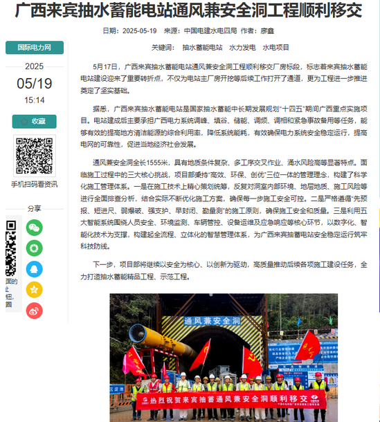 國際電力網:廣西來賓抽水蓄能電站通風兼安全洞工程順利移交 |